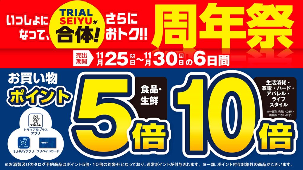 周年祭期間中はお買い物ポイントが最大10倍!さらに、期間中にSU-PAYアプリでチャージすると+ポイント3倍(相当)!