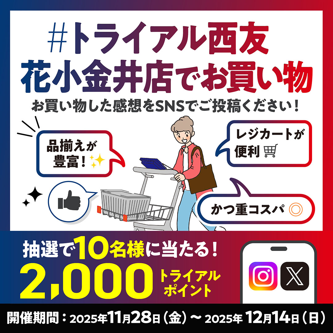 トライアル西友花小金井店でお買い物をして、ご自身のSNSで「#トライアル西友花小金井店でお買い物」をつけて感想をご投稿いただくと、抽選で10名様にトライアルポイント2,000ポイントをプレゼント!
