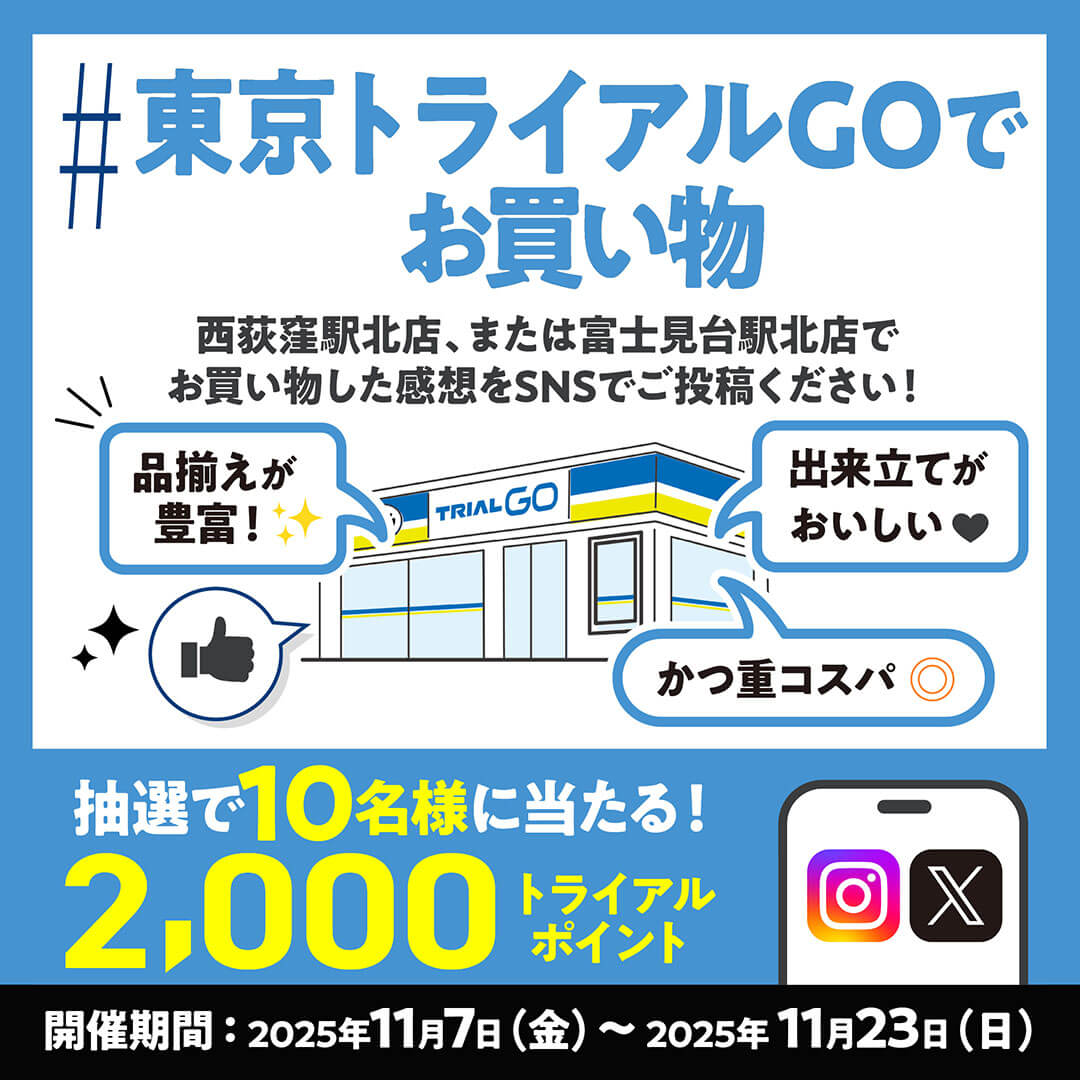 トライアルGO西荻窪駅北店、またはトライアルGO富士見台駅北店でお買い物をして、ご自身のSNSで「#東京トライアルGOでお買い物」をつけて感想をご投稿いただくと、抽選で10名様にトライアルポイント2,000ポイントをプレゼント!