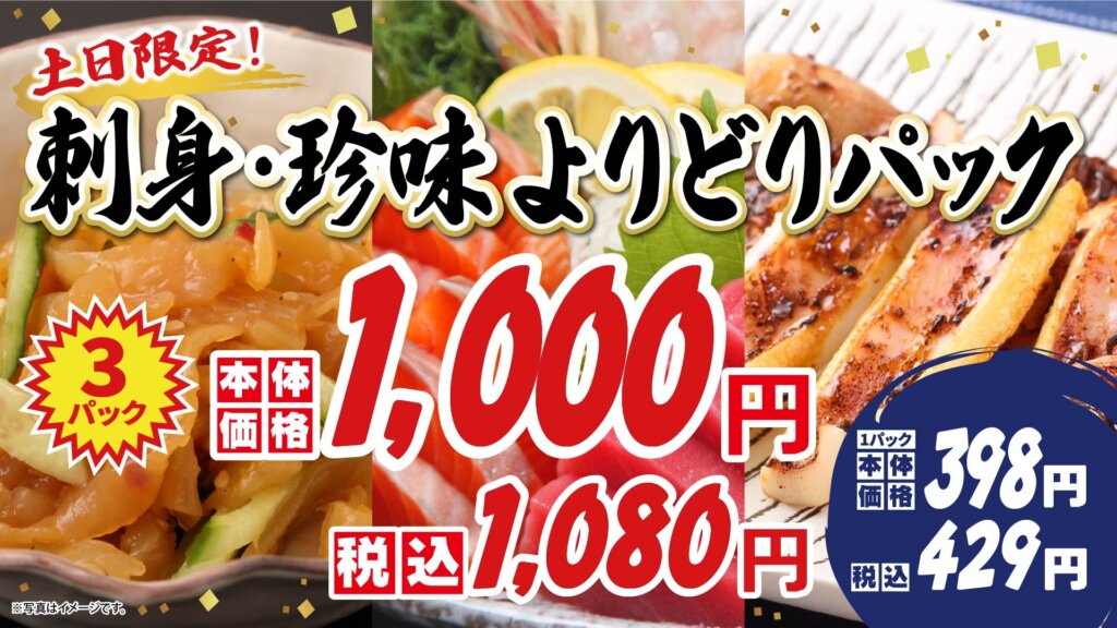 対象のお刺身などがどれでも3パックで【1,000円】(税込1,080円)!