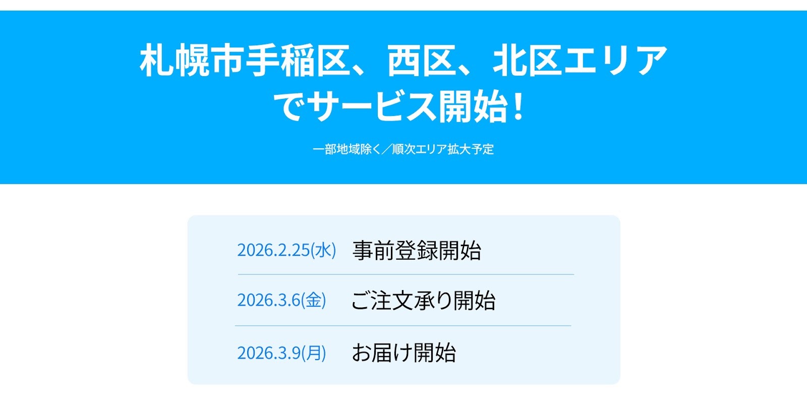 2月25日~26日の事前登録期間、サイト・アプリ上において、札幌市手稲区・西区・北区のサービス開始エリアがサービス対象地域として認識されない事象が発生しておりましたことを深くお詫び申し上げます。大変お手数ですが、サービス対象エリアをご確認の上あらためての会員登録をお願い申し上げます。