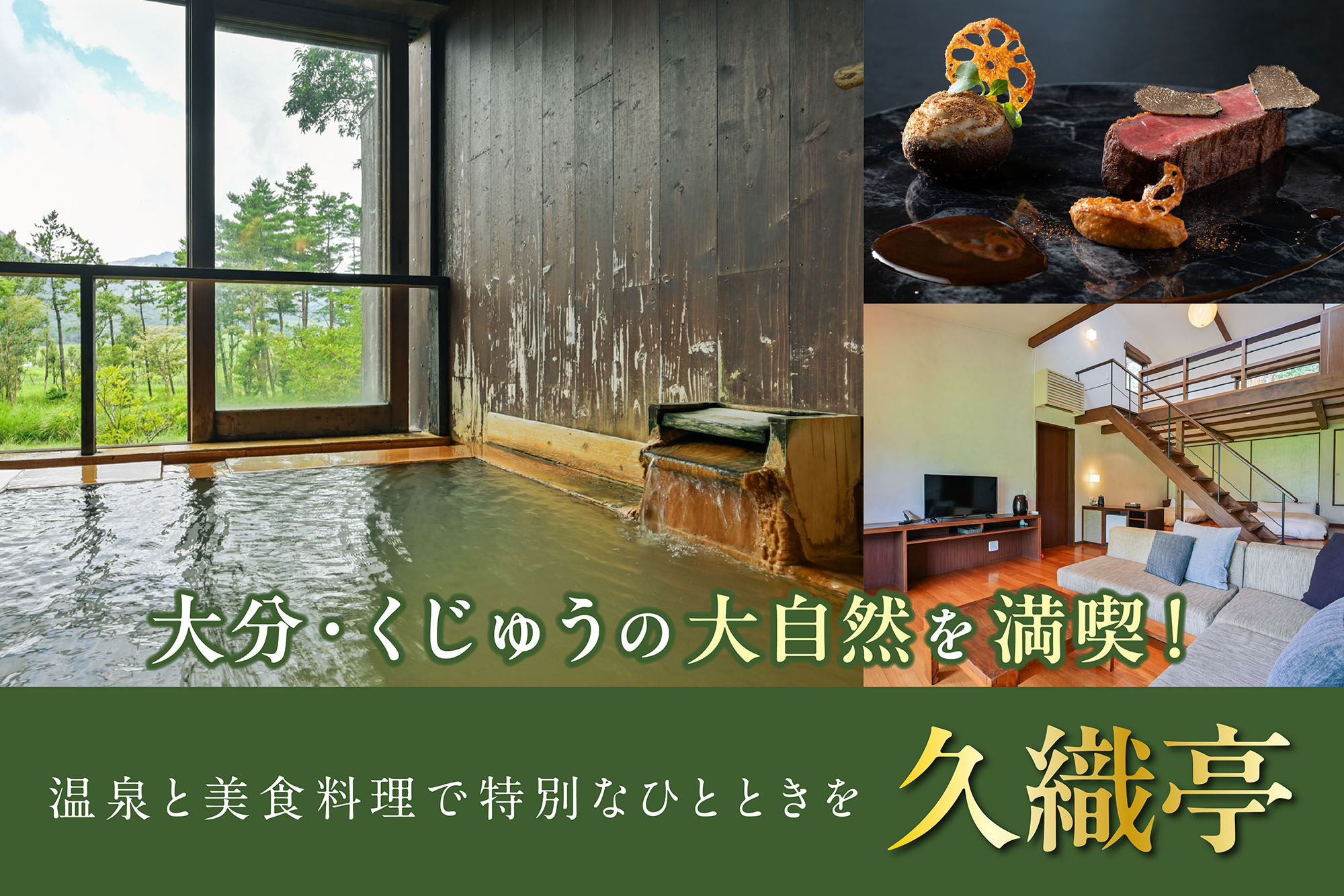 阿蘇・くじゅうの大自然に抱かれた「久織亭(くおりてい)」は、大分県に位置する全室温泉付きの宿。料理コンクールで3度の優勝経験を持つシェフが手掛ける和モダンフレンチと良質な温泉が、特別なひとときをお約束します。