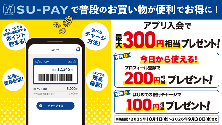 今ならSU-PAYを始めた方に最大300ポイント相当をプレゼント中で、とてもお得です!(※2025年10月1日(水)~2026年9月30日(水))プリカに残ったポイントも残高もSU-PAYに移行できるのでご安心ください。