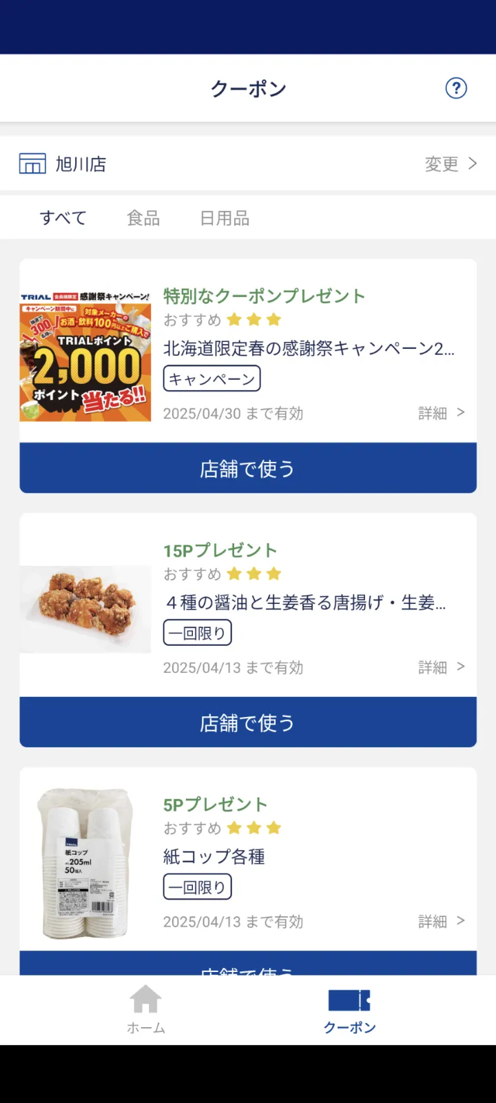 - 「北海道限定春の感謝祭キャンペーン2025」という名前のクーポンの「店舗で使う」ボタンをタップで応募完了