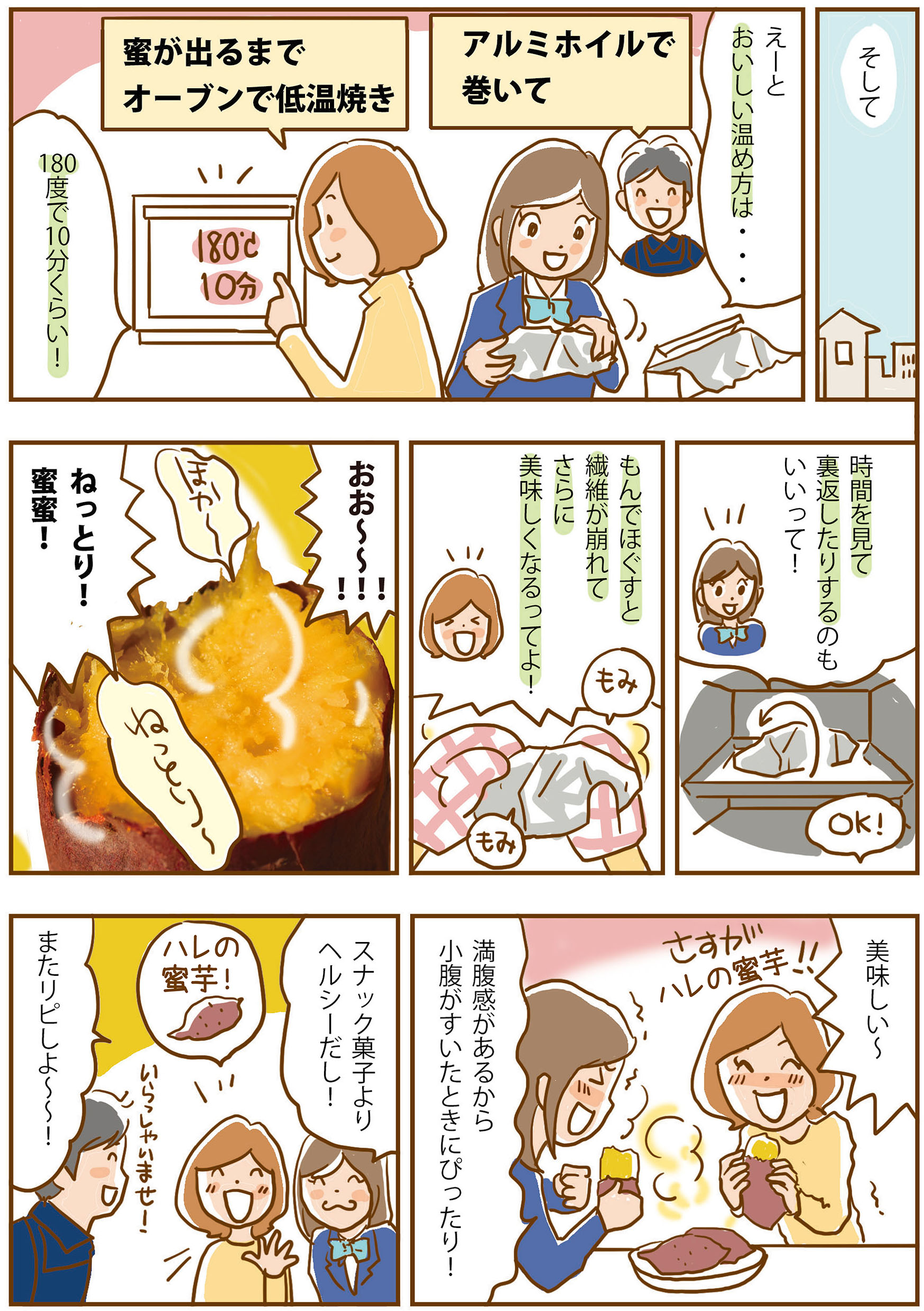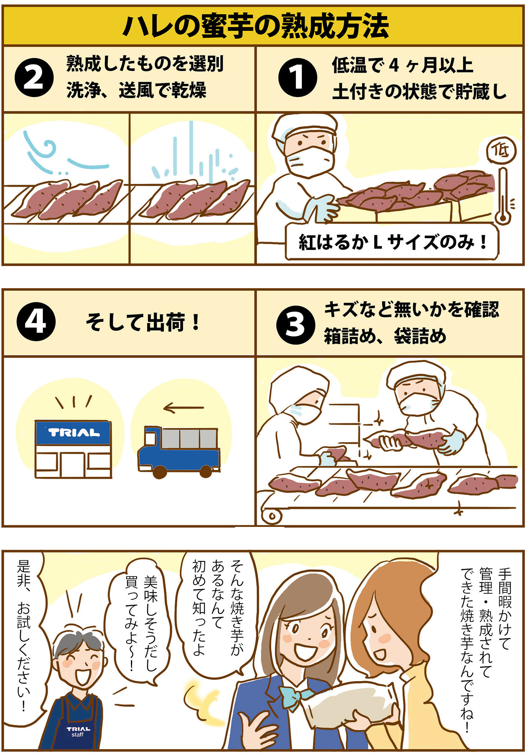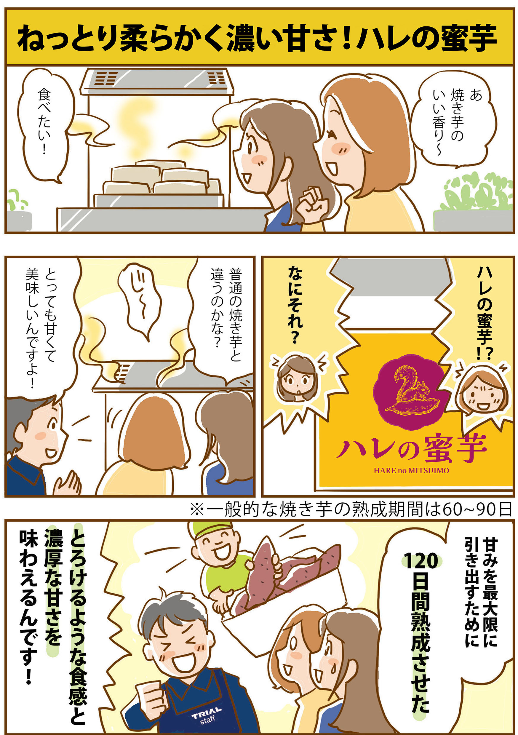 トライアルで販売されている「ハレの密芋」をご存じですか?Lサイズの紅はるかを120日もの長い月日をかけて熟成させた焼き芋なんです。 長期間の熟成で、甘みが最大限に引き出されているので、蜜たっぷりでとろける食感。芋好きの方に味わっていただきたい商品です。温め方なども漫画で紹介していますので、ぜひご覧ください。