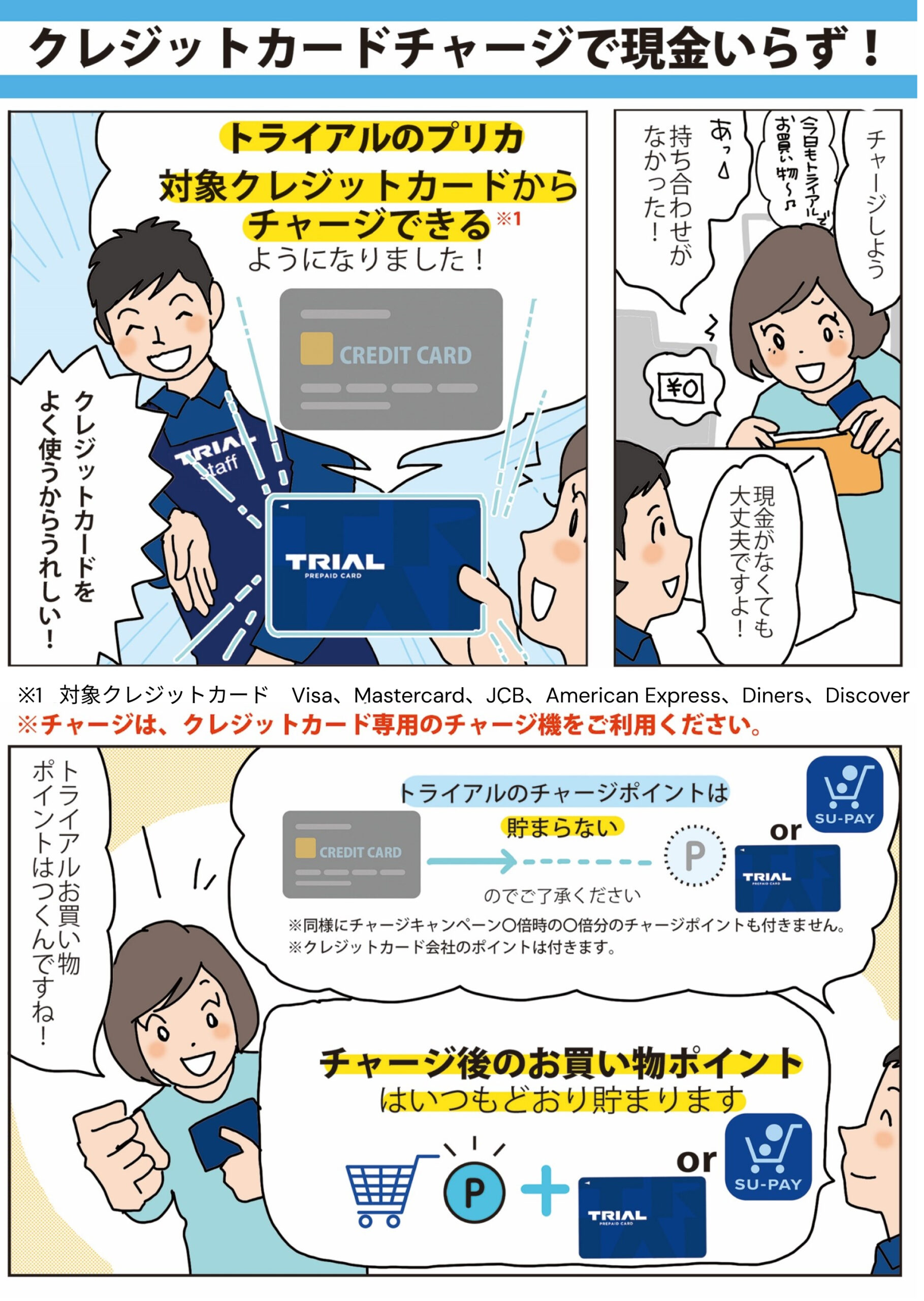 トライアルとは 2025.04.16 もう現金不要!?クレジットカードからもチャージが可能に! 店舗情報 クレジットカードのポイントを貯めている方、キャッシュレスでお買い物を楽しみたい方に、うれしいお知らせです。トライアルでのお買い物に便利なSU-PAY(スーペイ)、プリペイドカードがクレジットカードからもチャージできるようになりました。対象となるクレジットカードやチャージ方法などについて、漫画でわかりやすくご紹介します。 ▼SU-PAYのダウンロードはこちら▼ トライアルとは 2025.04.16 トライアルの支払い方法まとめ|ポイントが貯まるお得な方法も 合わせてこの記事を読む 合わせてこの記事を読む トライアルとは 2025.10.09 知らないと損!トライアルポイント活用術|チャージ&クーポンで賢く貯める方法 合わせてこの記事を読む 合わせてこの記事を読む 近くのお店を検索 関連記事 トライアルとは 2024.12.26 いつも安くて品揃え豊富!品質にもこだわる「トライアル」ってこんな店 店舗情報 トライアルとは 2021.06.24 24時間営業のスーパーって便利?深夜のトライアルに行ってみよう 店舗情報 トライアルとは 2025.06.25 レジ待ち時間が最短4分の1に!トライアルのレジカートの使い方 レジカート 店舗情報 トライアルとは 2021.06.24 おいしい旬の食材がいつでも安いのはなぜ?トライアルの生鮮食品の秘密 店舗情報 肉 野菜 魚介 トライアルとは 2021.10.01 プリペイド機能付きトライアルカードは使わなきゃ損!その理由は? プリペイドカード レジカート 店舗情報 トライアルとは 2021.10.05 迷ったらチェック!プリペイド機能付きトライアルカードの使い方 プリペイドカード レジカート 店舗情報 トライアルとは 2025.09.30 トライアルの肉が安くておいしい理由は?鮮度&安心安全へのこだわり 店舗情報 肉 トライアルとは 2021.11.16 野菜・果物など毎日食べたいトライアルの青果、鮮度と味へのこだわり 店舗情報 果物 野菜 トライアルとは 2021.12.27 トライアルの魚は一級品!安くても鮮魚店、寿司店と並ぶ品質を実現 寿司 店舗情報 魚介 トライアルとは 2025.03.27 トライアル新店舗!事前登録でお得に&スマートにお会計! 店舗情報