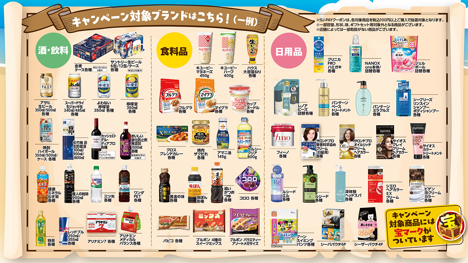 キャンペーン期間中、SU-PAYの「クーポン」タブから対象商品をタップして、同一商品を100円(税込)以上購入すると応募完了。目印は「宝」マークです!
