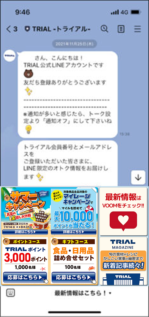 - お近くのトライアル店舗の公式LINEを友だちに追加し、トーク画面を開く