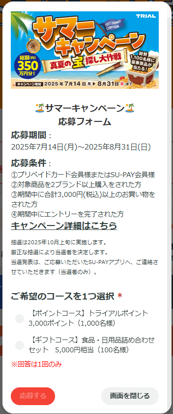 - 「トライアル公式LINE」、「SU-PAY」、「レジカート」のいずれかから応募