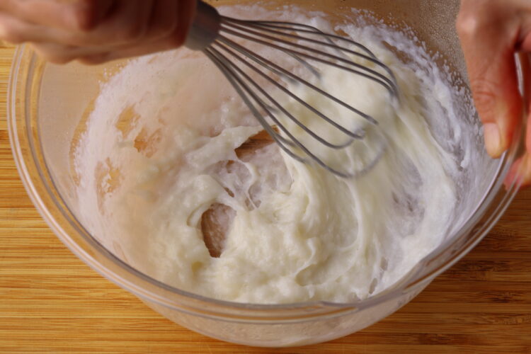 4.熱いうちに、ホイッパーで餅を押すように潰しながら牛乳となじませる。