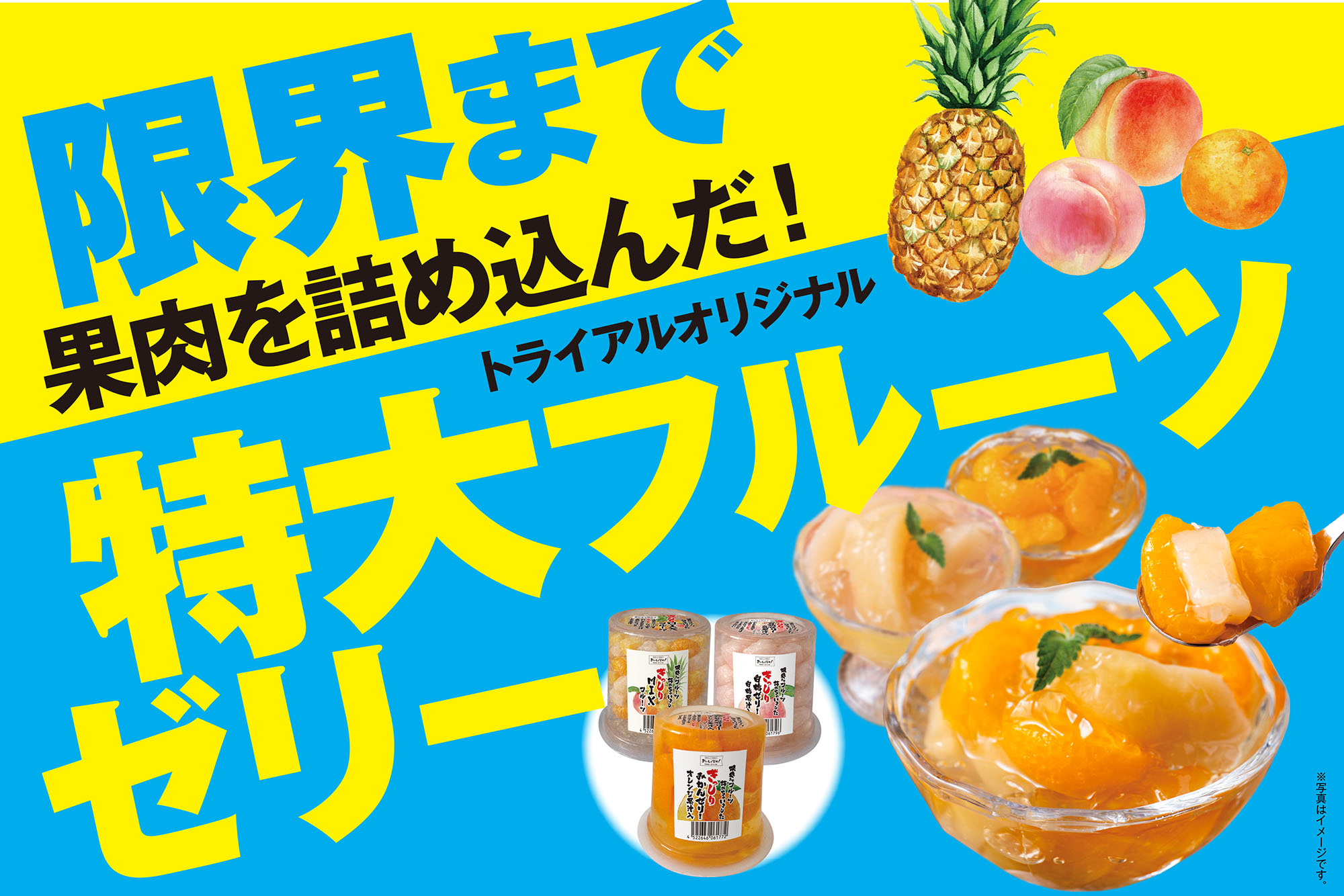 トライアルではこれまでも、中身がぎっしり詰まったシュークリームやビッグサイズのプリンなど、ボリュームとおいしさにこだわった商品をお届けしてきました。今回のゼリーもそのひとつ。「今後もお客さまに喜んでいただけるよう、驚きのあるスイーツに挑戦したいですね」と、すでに次の展開を考えています。