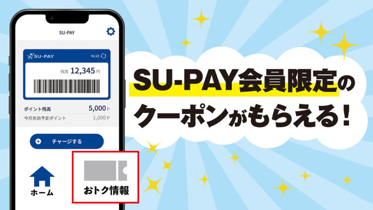SU-PAYでは、通常よりもポイントがさらに貯まるクーポンを定期的に配信しています。いつもの買い物でポイントを賢く、お得に貯めたい方におすすめです。