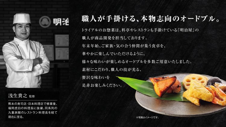 年末年始の食卓を彩るごちそうのひとつ、オードブル。毎年トライアルでもご好評いただいております。2022年も、トライアルの惣菜を監修する株式会社明治屋が試行錯誤を重ね、自信を持っておすすめできる商品に仕上がりました。