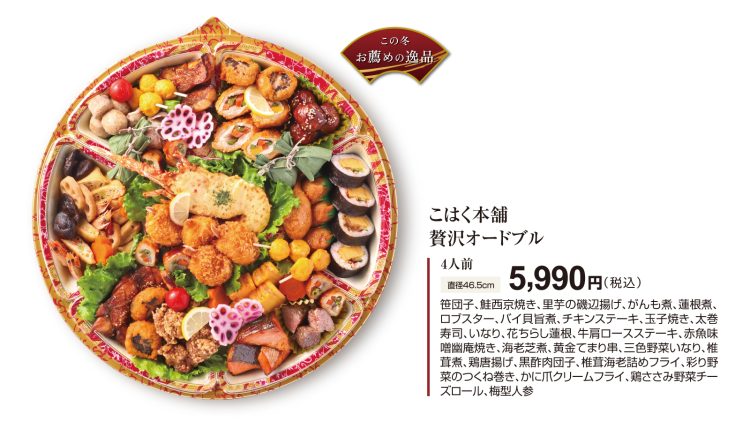 このような豪華な惣菜に加え、太巻寿司やいなりまで入っている大満足の内容になっています。年末年始のごちそうにぴったりな商品です。九州限定の珍しいオードブルになります。予約限定商品です。